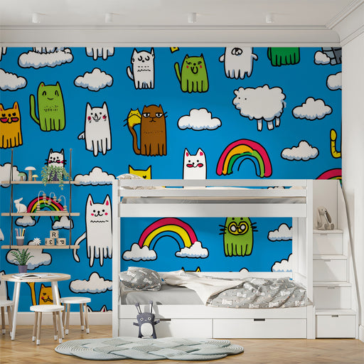 View full detailsKawaii Kitten Rainbow Cloud Pattern | Repetitive Motif, Sky Blue Nursery Wallpaper