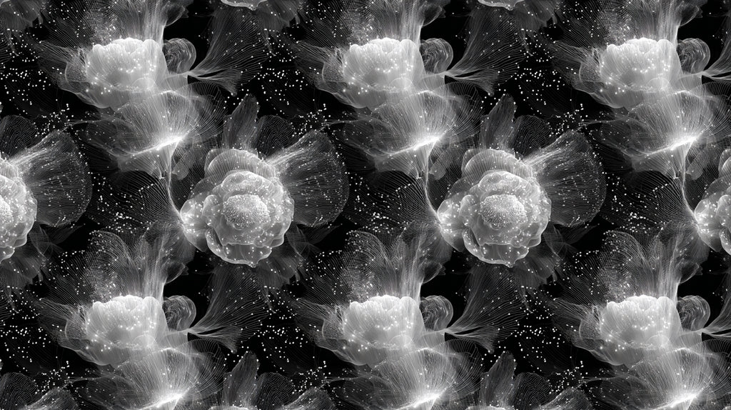The Black & White Fiber Optic Bloom Mural is a dramatic and striking contemporary design. The pattern features large-scale, abstract floral-like shapes rendered with brilliant white, glowing fiber optics and light streaks against a solid black background. The high-contrast palette and dynamic, bursting forms create a sense of futuristic energy and artistic spectacle. This mural is a perfect focal point for a bold living room, an entertainment area, or a modern dining room.