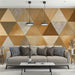 The Geometric Triangle Wood Mosaic Mural Wallpaper is a warm, structured, and highly textural artwork. It features a continuous pattern of interlocking triangles, rendered in various warm shades of brown, tan, and cream, each with a subtle woodgrain texture. The clean geometric shapes and the earthy palette create a modern, sophisticated patchwork effect, ideal for a space with a Scandinavian or modern rustic theme. This mural is perfect for a cozy living room, a restaurant, or a contemporary office.