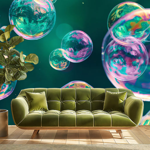 VIVAWALLSThis stunning wallpaper showcases a captivating design of large, luminous bubbles floating against a solid deep teal background. The bubbles featur...
