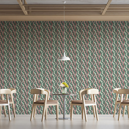 This wallpaper features a very dense pattern of fine, vertical wavy lines. The design, in a soft, muted palette of pale green, light pink, and off-...