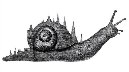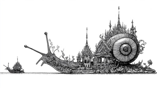 Vivawalls StoreThis detailed black and white illustration depicts a massive snail carrying an incredibly ornate and multi-tiered structure on its shell, resemblin...