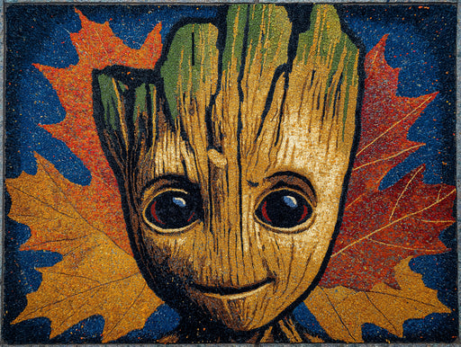 Vivawalls StoreThis vibrant, close-up digital painting depicts a stylized, wooden character mask (resembling Baby Groot) with large, dark eyes, rendered with visi...
