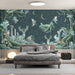 Step into a magical world with this dark, moody forest mural. Against a deep green background, glowing mushrooms, crystals, and floating islands set the scene for fairies, a majestic deer, and a fox. Celestial elements like moons and constellations add to the mystical, fairytale atmosphere.