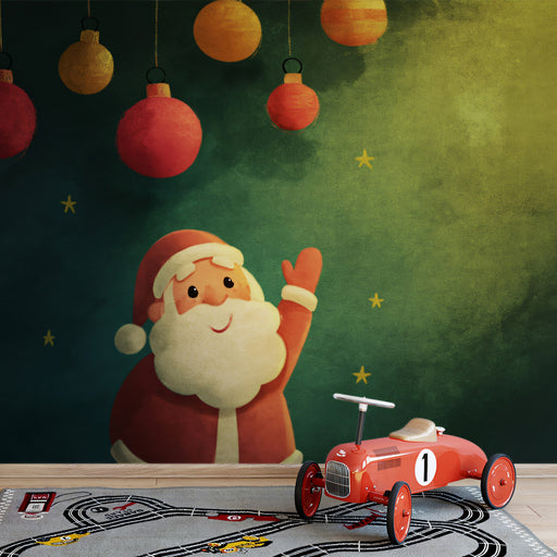 The Snowy Cabin and Elves Illustration Mural Wallpaper offers a wide, atmospheric vista of a winter forest and a cozy cabin. The scene is dominated by cool, soft mint green and gray tones, with snow-dusted evergreen trees receding into the foggy background. A small, cozy cabin with a brick chimney and a few playful figures (elves and Santa) stands in the foreground. The high level of negative space and soft colors create a peaceful, tranquil, and slightly whimsical holiday setting. This mural is ideal for a bedroom, a calming nursery, or a modern Nordic-style living space.