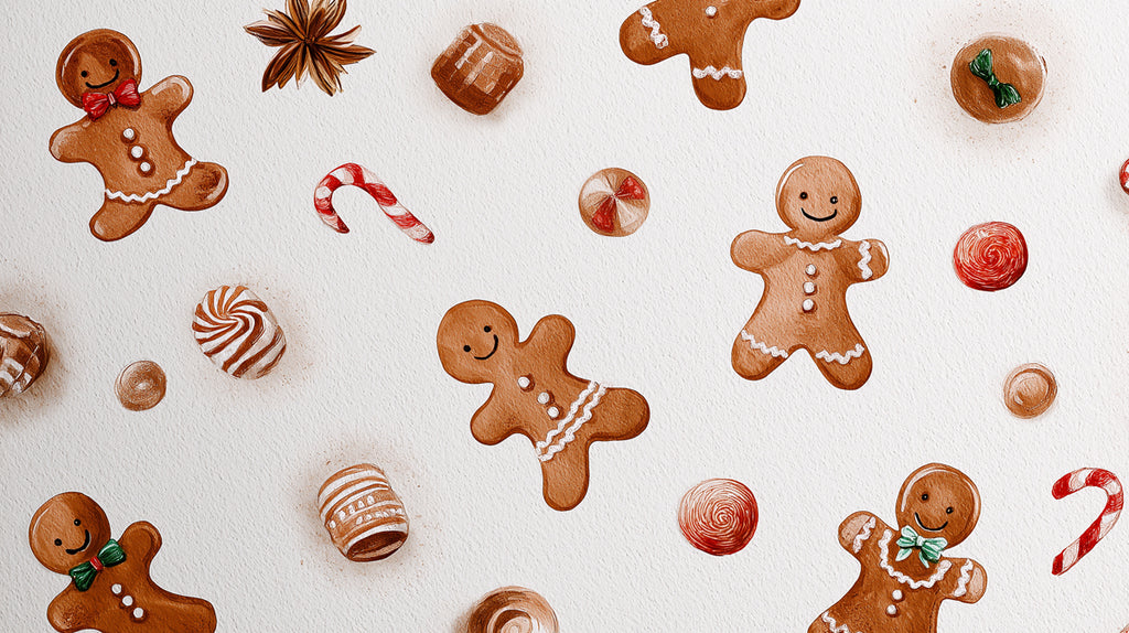 Watercolor Gingerbread and Candy Scatter Wallpaper | Food Illustration — Vivawalls Store Skip to content
