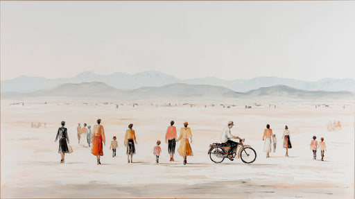 Vivawalls StoreA scene of quiet endurance and journey, this impressionist-style mural shows a group of figures walking and cycling across a vast, pale desert land...