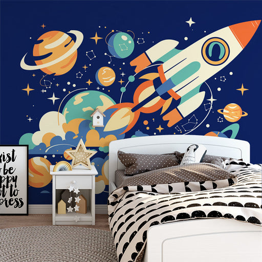 Space Rocket and Planets Mural Wallpaper | Blue Orange Yellow and White Rocket and Planets