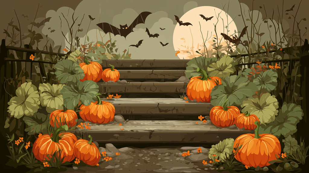 Step into a charming, rustic Halloween night with this inviting wallpaper, featuring weathered stone steps adorned with numerous bright orange pumpkins. Lush, leafy pumpkin vines intertwine around the steps and a dark, wrought-iron fence, creating a picturesque autumnal scene. In the background, a large, soft full moon illuminates a hazy sky with fluttering bats, adding a classic spooky touch to the cozy setting. The muted, earthy color palette evokes a sense of vintage charm and comforting fall traditions. This illustration is perfect for creating a warm and welcoming Halloween ambiance in nursery, playroom, or any space that appreciates a classic and timeless festive look.