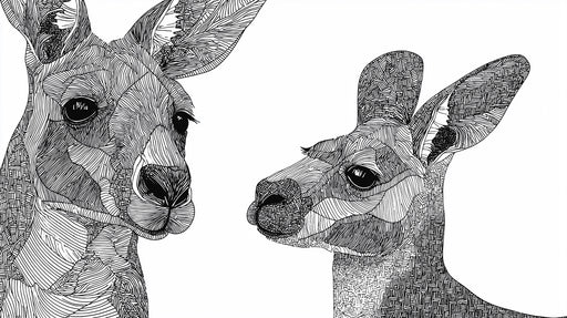 VIVAWALLSDer Känguru Abstrakte Linienkunst Mural Tapete ist ein auffälliges, grafisches und komplexes Kunstwerk. Es zeigt die Nahaufnahme Porträts zweier Kä...