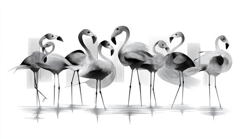 Vollständige Details anzeigenAbstrakter Flamingoschwarm, monochrome Linienführung, Wandmalerei Tapete | Wasserreflexion, dynamische Vogelkunst