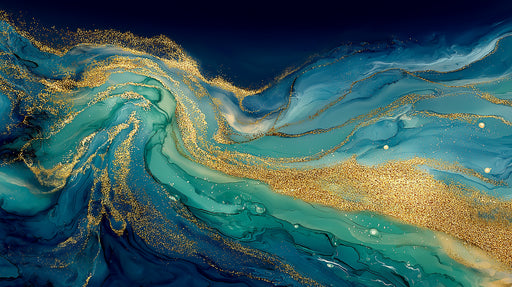 Vivawalls StoreDas Tiefsee-Goldglitzer-Fluss-Malerei-Tapete ist ein faszinierendes und opulentes Kunstwerk. Es zeigt wirbelnde Strömungen aus tiefem Teal und Navy...