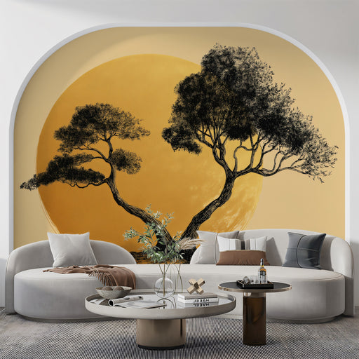 Vollständige Details anzeigenZen Entwined Trees Wall Mural | Minimalist Ink Sketch Art & Golden Sun Symmetry Background