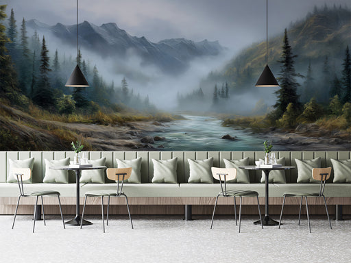 Vivawalls StoreBring the moody grandeur of the mountains into your space. This panoramic mural features a rushing river winding through a deep alpine valley, surr...