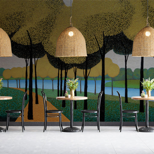 Vivawalls StoreCapture the romantic mystery of a park at twilight. This atmospheric impressionist mural features a lakeside path lined with trees in brilliant sha...