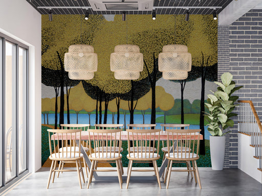 Vivawalls StoreThis unique wall mural features a stylized golden forest by a serene blue river, rendered in a modern pointillist and impasto style. The dense, tex...