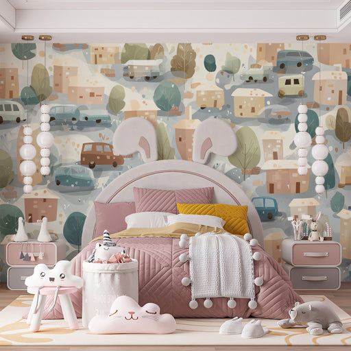 Vollständige Details anzeigenOverhead City Street Map Mural | Yellow Buildings, Cartoon Cars, Playful Townscape