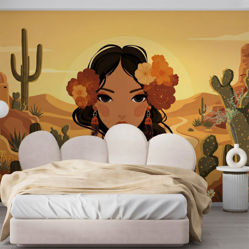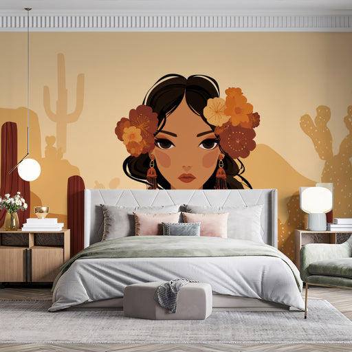 Vivawalls StoreCelebrate the warmth of the desert with this striking vector-style portrait. A beautiful woman with cascading dark hair and vibrant flowers stands ...