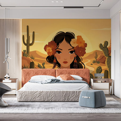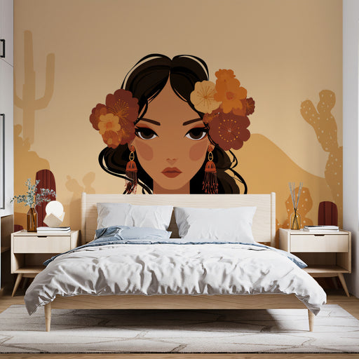 Vivawalls StoreEmbrace the warmth of the sun-drenched desert with this bold vector art portrait. A beautiful woman with dark hair adorned with orange flowers stan...