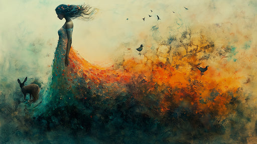 VIVAWALLSDieses ätherische und mythische Hintergrundbild zeigt die Silhouette einer Frau, die eins mit der Natur ist. Ihr langes, fließendes Gewand löst sic...