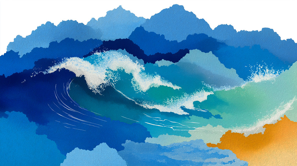 The Modern Coastal Mural Wallpaper is a dynamic and vibrant take on a classic beach scene. The design features an abstract landscape with a warm, sandy beach and a turquoise ocean, beautifully dominated by a large, powerfully crashing white wave. The layered, painterly texture and bold, simplified shapes bring a sense of energetic movement and artistic freedom to your walls. This mural is a captivating choice for a playful dining room, a modern living room, or a stylish home office that seeks a unique, coastal-inspired focal point.