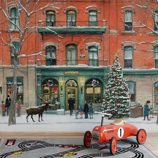 Vollständige Details anzeigenFestive Urban Winter Scene Wallpaper | Charming City Block with Deer