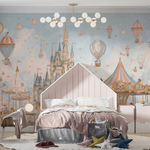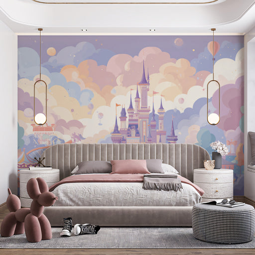 Vivawalls StoreA whimsical fantasy wall mural featuring a magnificent castle surrounded by an amusement park under a sky filled with pastel clouds and hot air bal...