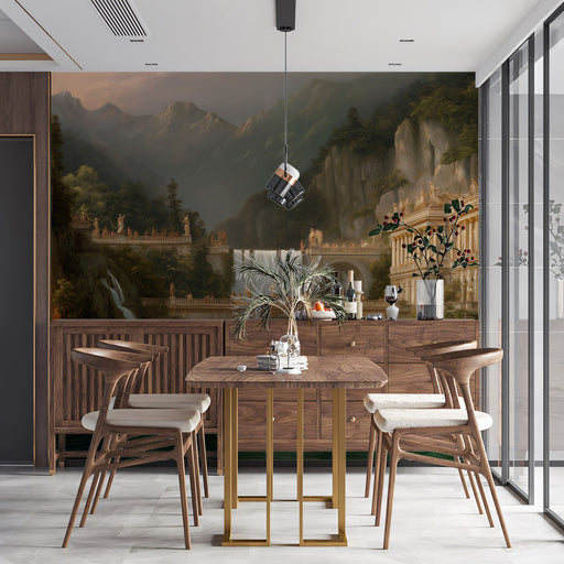 Vivawalls StoreStep into a world of myth and legend with this epic fantasy landscape mural. It depicts a magnificent classical palace built into towering cliffs, ...
