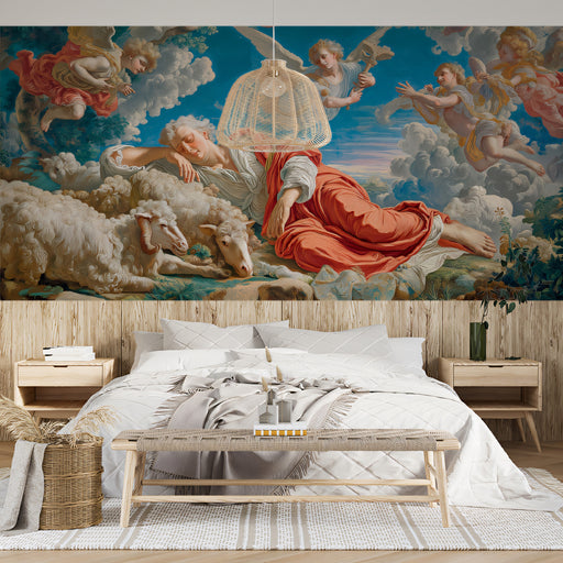 Vivawalls StoreThis rich Baroque-style mural captures a moment of divine rest. A figure in flowing red and white robes sleeps peacefully among his sheep, while ov...