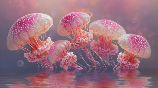 Vollständige Details anzeigenRosa und weiße Quallenansammlung Wandgemälde | Pastellfarbpalette, Oberflächenreflexion, traumhafte Szene