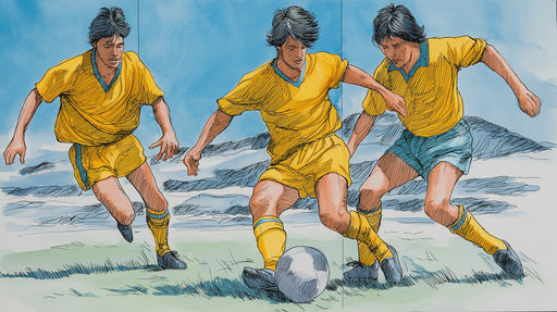 Vollständige Details anzeigenVintage Comic Fußball Aktion Wandgemälde Tapete | Gelbe Trikots, Retro Illustration, Dynamischer Bewegungsfokus