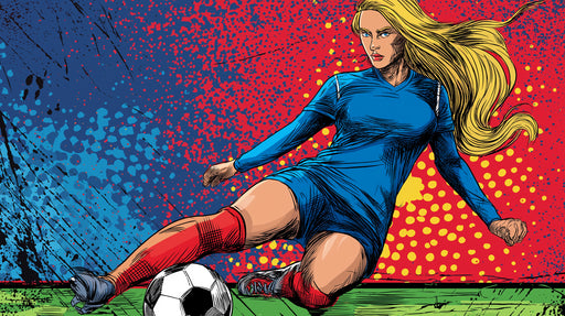 Vollständige Details anzeigenFrauenfußballer Pop Art Wandgemälde Tapete | Starke Figur, Roter und Blauer Kontrast, Aggressiver Grunge-Stil