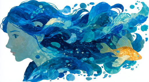 Vollständige Details anzeigenÄtherische Wassergöttin mit Goldfisch Mural Tapete | Surreale blaue Wellensilhouette, Flüssiges Porträt