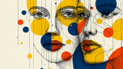 Vollständige Details anzeigenGrafische Punktmuster Überlagerung Frauliches Portrait Wandgemälde Tapete | Primärfarbige Kreise, Zeitgenössische Feinlinienskizze