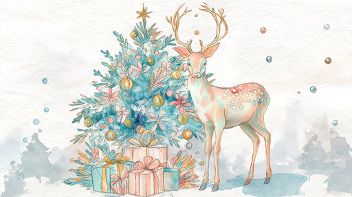 Vollständige Details anzeigenPastell Hirsch- und Geschenke Aquarell Wandtapete | Weichzeichner, Rosa- und Blaugrüntöne, verspielte Kunst