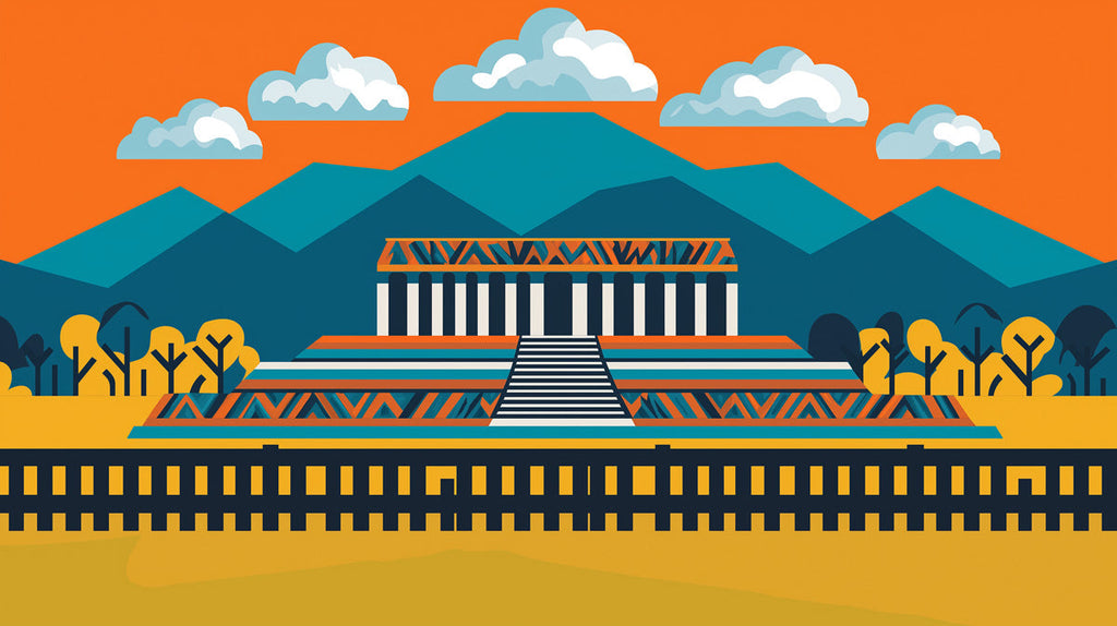 Dieser Hintergrundbildschirmschoner zeigt einen antiken Tempel mit geometrischen Mustern, der gegen orangene Himmel und blaue Berge abgesetzt ist und vibriert mit lebendigem kulturellem Energie. Die fettgedruckten Formen und Farben machen ihn zu einem bildungsreichen und visuell anregenden Element für ein Kinderzimmer.