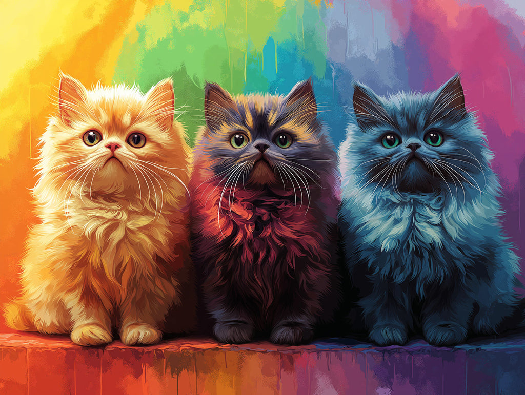 Die natürlichen Fellfarben der Katzen bilden eine wunderschöne Kontrast zu der pastelgefärbten Hintergrund. Die warmen Töne der orangefarbenen Katze ergänzen die kühleren Schattierungen im Hintergrund, während die dunkelbraunen und schwarzen Katzen einen soliden Kontrast bieten. Die Pastelfarben selbst sind weich und harmonisch und schaffen eine ausgewogene visuelle Erfahrung, die sowohl auffällig als auch beruhigend ist.