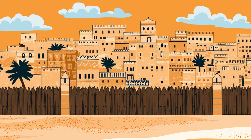 Wärmende Orangen- und Gelbfarben am Himmel ergänzen die erdigen Braunfarben der Festungen, während blaue Flaggen einen auffälligen Kontrast bieten. Die Farben imitieren eine sonnenbeschienene Wüstenlandschaft und schaffen eine visuelle Harmonie.