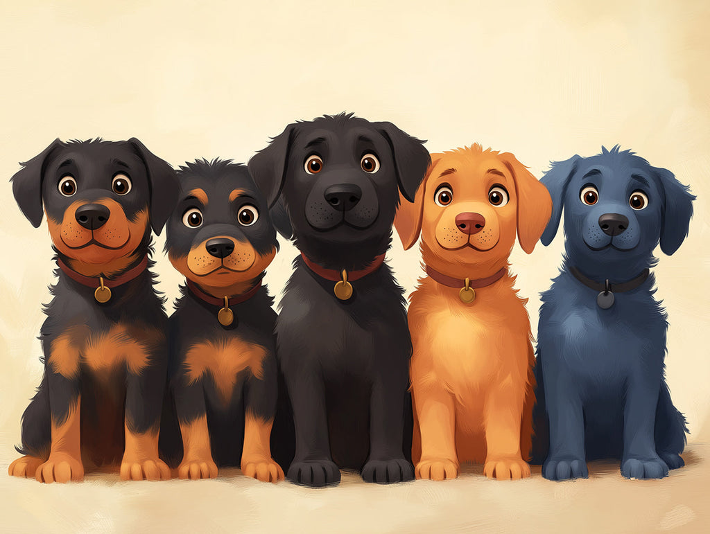 Der neutrale Hintergrund lässt die verschiedenen Farben des Felles der Hunde, wie Schwarz, Braun, Orange und Blau, auffällig hervorstechen. Die Verwendung einer neutralen Farbe gewährleistet, dass der Fokus auf den Hunden verbleibt und bietet gleichzeitig einen beruhigenden Hintergrund. Das gesamte Farbschema ist ausgewogen, wobei die lebendigen Fellfarben der Hunde dem sonst einfachen Hintergrund Leben verleihen.