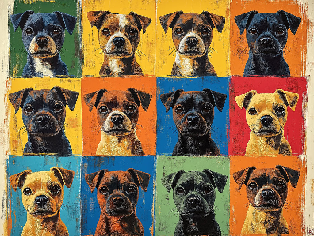 Die verschiedenen Farben der Hundeporträts werden durch die vielfältigen Hintergrundfarben ergänzt. Die gesamte Farbpalette ist lebendig und heiter, wobei die verschiedenen Farbtöne zusammenwirken, um eine visuell anregende und ausgewogene Komposition zu schaffen. Der Kontrast zwischen den Fellfarben der Hunde und den Hintergrundfarben lässt jedes Portrait hervorstechen und trägt gleichzeitig zur Gesamtzusammenhang der Wandmalerei bei.