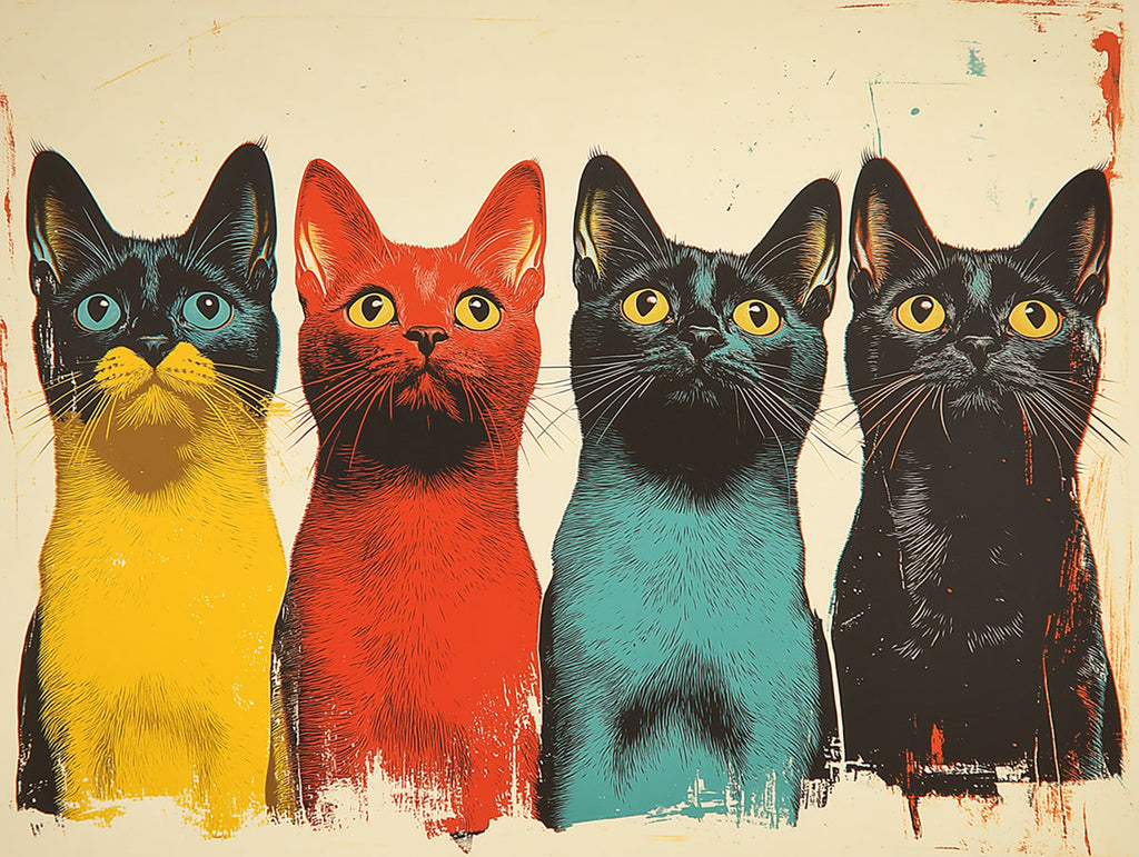 Die leuchtenden Primär- und Sekundärfarben der Katzen (Gelb, Rot, Blaugrün, Schwarz) bilden eine optisch anregende und harmonische Palette. Der Kontrast zwischen den Katzenfarben und dem neutralen Hintergrund verstärkt ihre Kühnheit. Die Verwendung einer begrenzten Farbpalette für die Merkmale der Katzen, wie die durchgängig gelben Augen, verbindet das Design und macht es sowohl auffällig als auch stimmig.