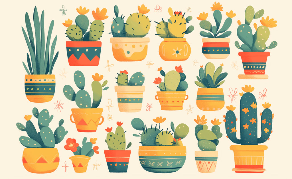 Die Farben in diesem Hintergrundbild sind harmonisch und schaffen eine fröhliche und einladende Atmosphäre. Das Grün der Kakteen ist die dominierende Farbe und bietet eine natürliche und beruhigende Basis. Die orangefarbenen Akzente fügen eine warme und energetische Note hinzu, während der beigefarbene Hintergrund das Design nicht zu überwältigend macht und alles zusammenhält.