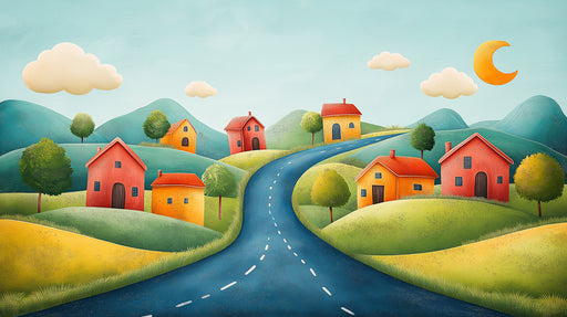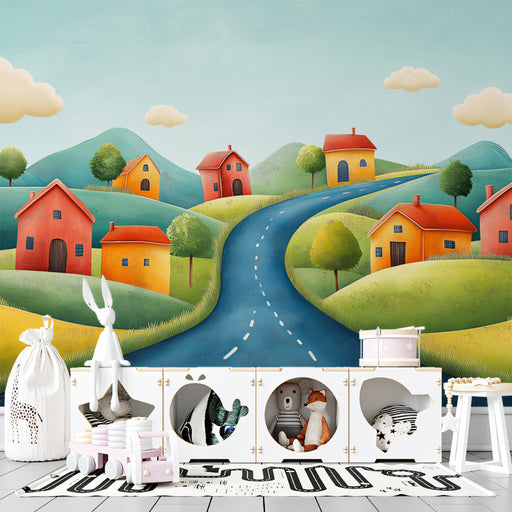 Winding Road Through a Whimsical Village Mural Wallpaper | Playful Countryside Scene