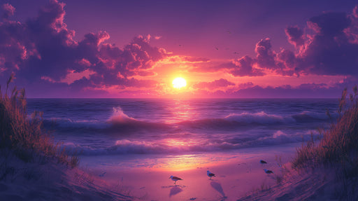 Vollständige Details anzeigenSonnenuntergangsstrahlung Wandbildtapete | Lila Himmel & Feuriger Ozean-Glanz im Wohnzimmer oder in einer Lounge