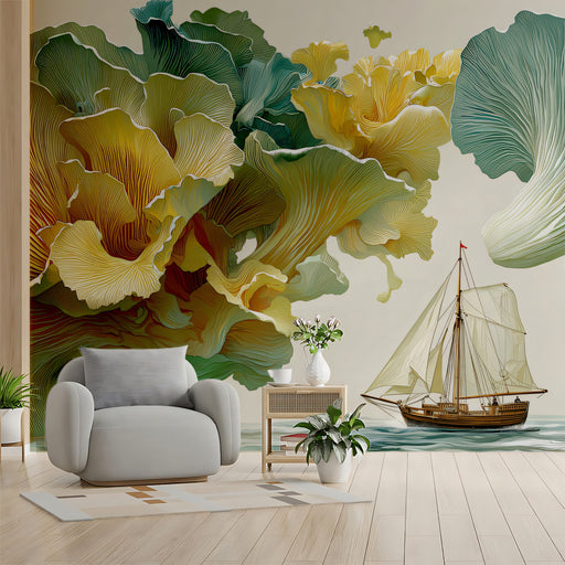 Bloom WallThe Surreal Giant Coral Fungi and Sailboat Wall Mural features a breathtaking, dreamlike composition of massive, flowing oyster mushroom or coral-l...