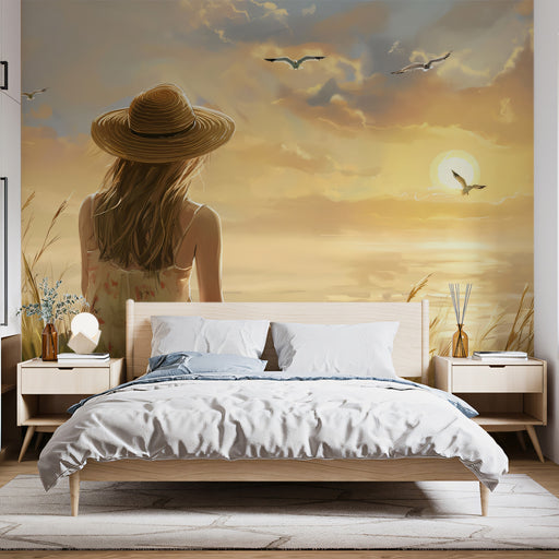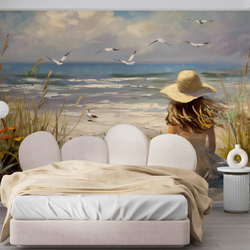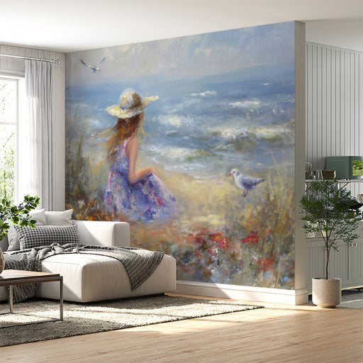 Vivawalls StoreA serene impressionist wall mural capturing a girl in a sun hat looking out at the ocean. Surrounded by swaying tall grass, wildflowers, and seagul...