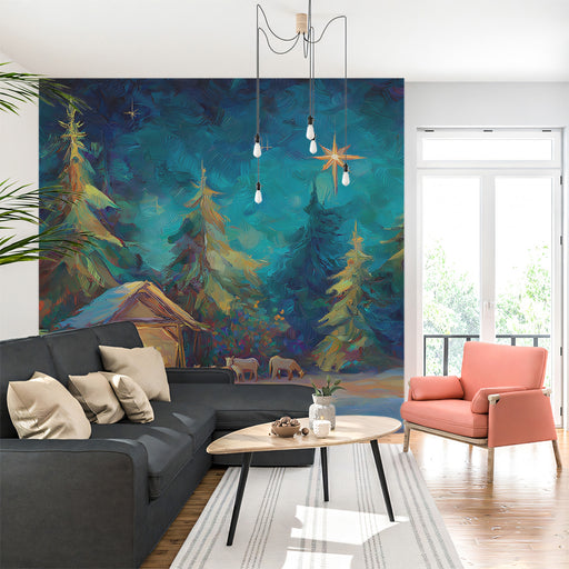 Vollständige Details anzeigenForest Nativity Oil Painting Mural Wallpaper | Evergreen Trees, Deep Blue Night, Expressive Brushwork