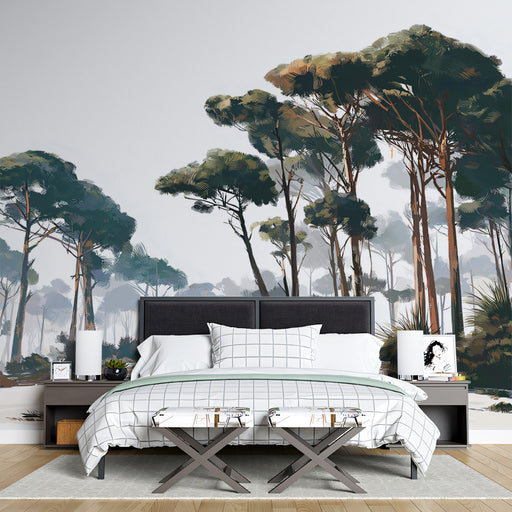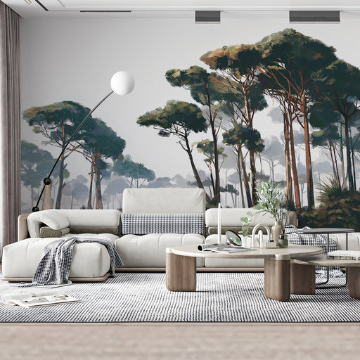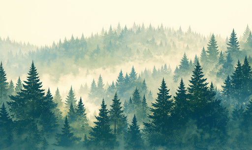 VivawallsDieses Hintergrundbild zeigt eine friedliche neblige Waldszene mit hohen Kiefern in verschiedenen Grüntönen und Blautönen vor einem weichen Beige-H...