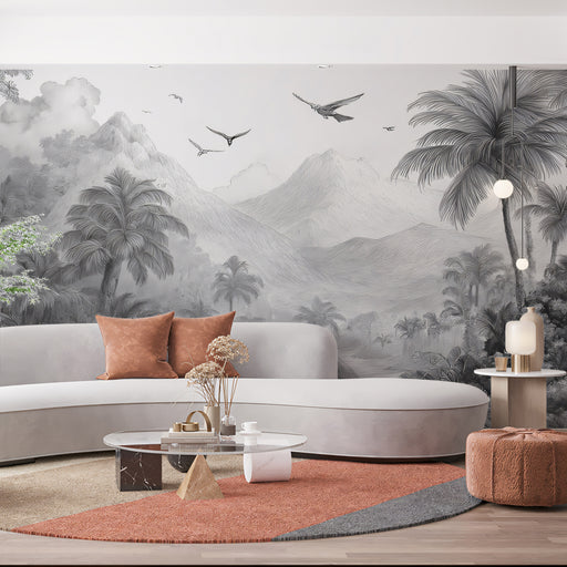 Vollständige Details anzeigenDramatic Monochrome Jungle Mural Wallpaper | Majestic Landscape & Mountains