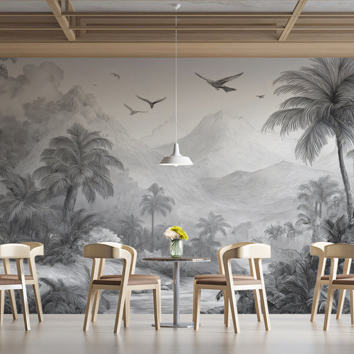 Vollständige Details anzeigenMonochrome Tropical Jungle Mural Wallpaper | Intricate Landscape with Mountains